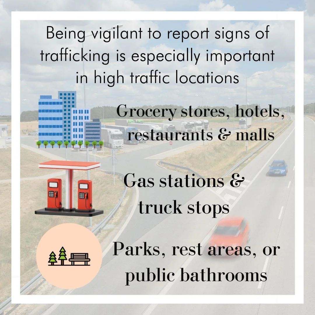 Traffickers and predators who are trying to exploit missing children will often place themselves purposefully in highly populated areas frequented by travelers or runaways. It is important to report any signs of trafficking or distressed children at all times, but especially in locations like grocery stores, hotels, restaurants, malls, gas stations, truck stops, parks, rest areas, or public bathrooms.